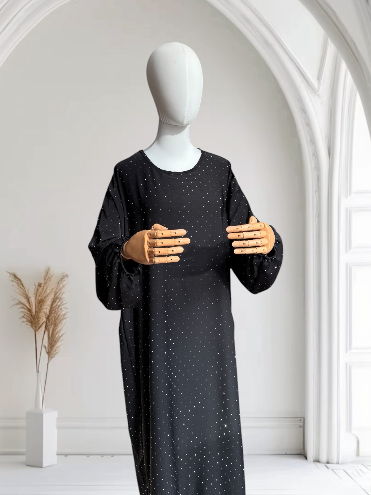 Diese edle Abaya aus hochwertiger Medina-Seide ist ein wahres Highlight für besondere Anlässe. Mit ihren funkelnden Strasssteinchen, die sich stilvoll über die gesamte Vorderseite oder das komplette Kleid verteilen, verleiht sie dir einen glamourösen und dennoch dezenten Look – perfekt für Eid, Hochzeiten oder festliche Abende.