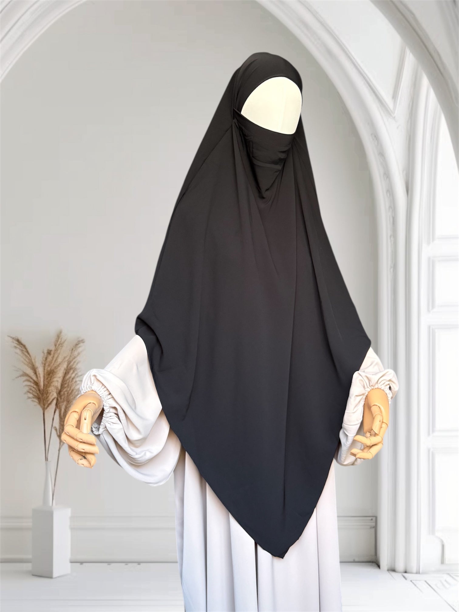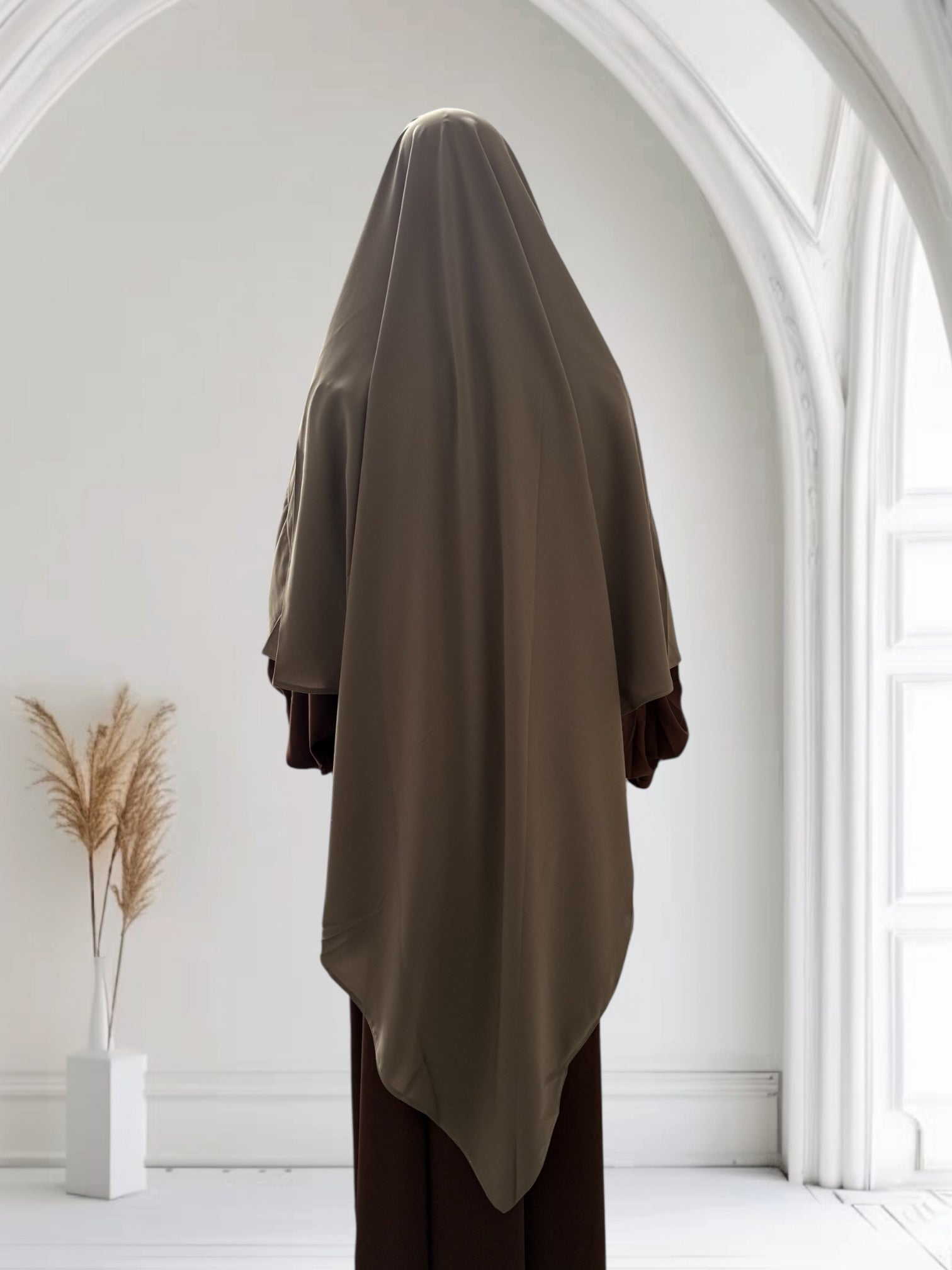 Dieser mittellange Khimar aus edler Medina-Seide am Kopf und Kinn dehnbar vereint Schlichtheit, Eleganz und Komfort in einem stilvollen Stück, das sowohl im Alltag als auch zu besonderen Anlässen getragen werden kann.